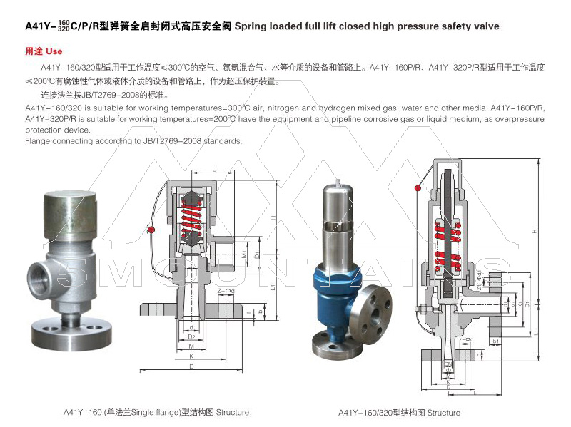 A41Y-160/320型彈簧微啟封閉式高壓安全閥適用于工作溫度≤200℃的空氣、氮氫混合氣、水等介質(zhì)的設備和管路上。A41Y-160P/R、A41Y-320P/R型彈簧微啟封閉式高壓安全閥適用于工作溫度≤200℃有腐蝕性氣體的設備和管路上,作為超壓保護裝置。