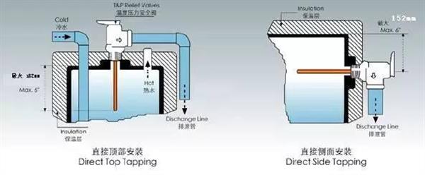 溫度安全閥應(yīng)安裝與熱水器頂部或側(cè)面,如下圖: